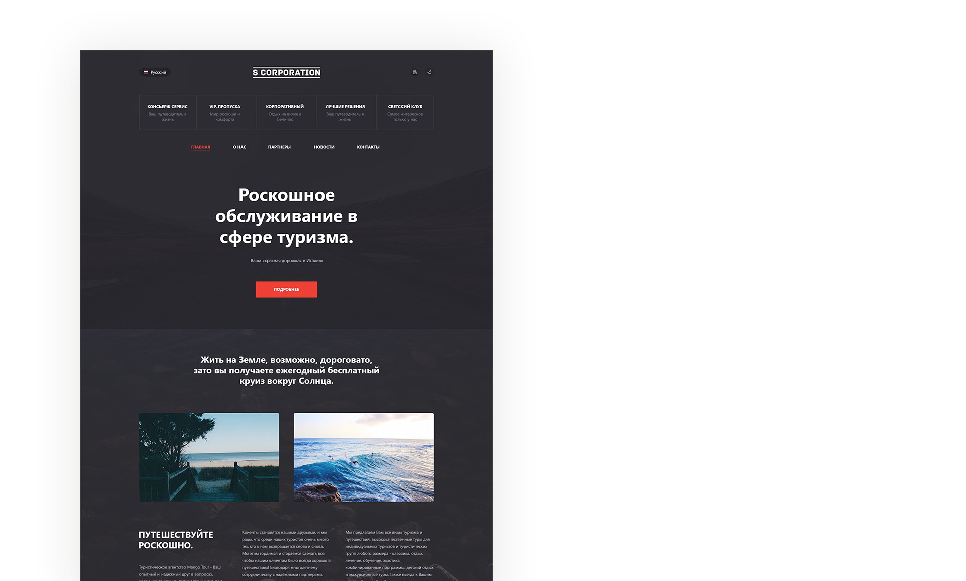Единогласно была выбрана именно темная концепция. При этом для акцентов использован активный красный цвет, а также фото умопомрачительных мест, где хотел бы побывать каждый.